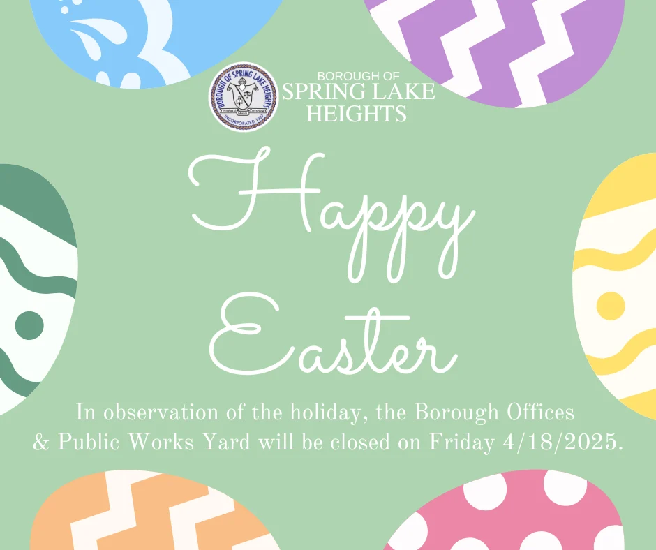 Borough Holiday Closure In observation of the holiday, the Borough Offices and Public Works Yard will be closed on Friday April 18, 2025. Spring Lake Heights2025-04-23T11:18:18-04:00